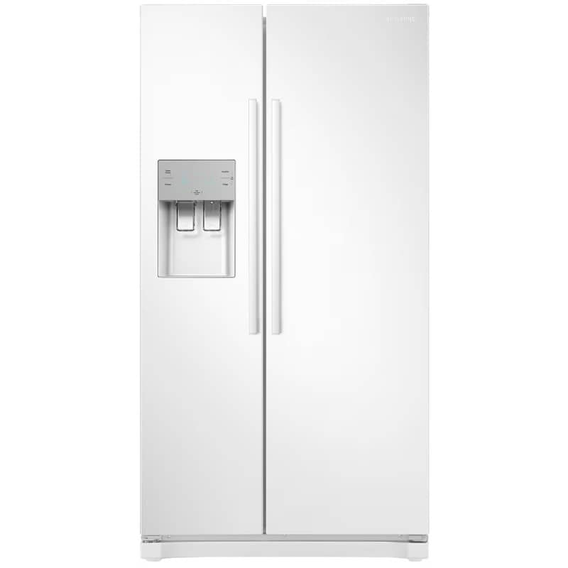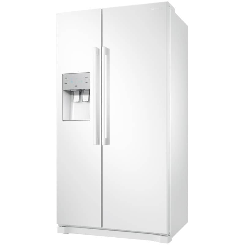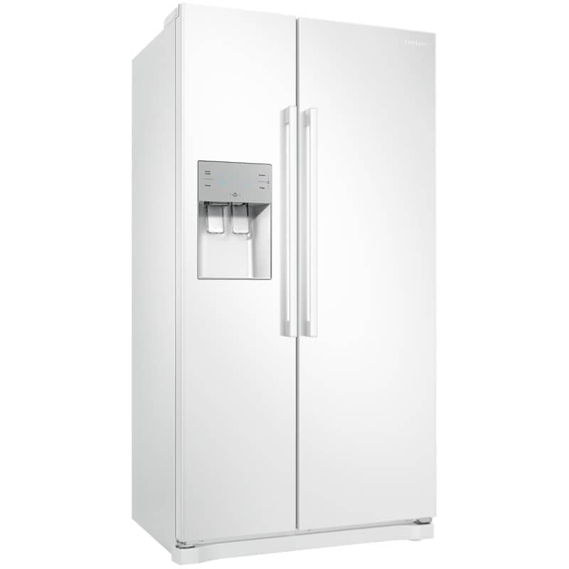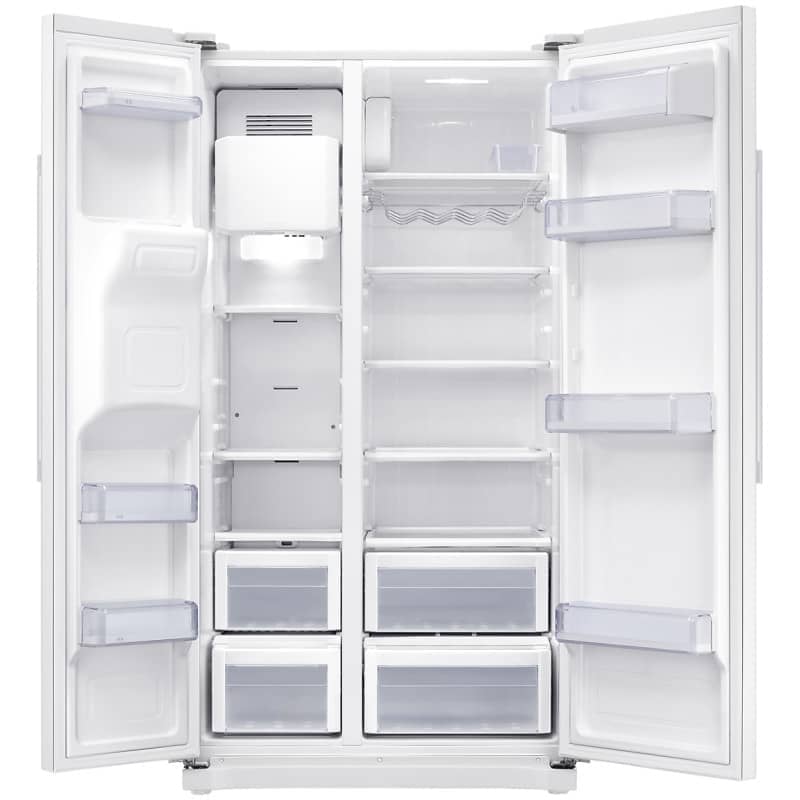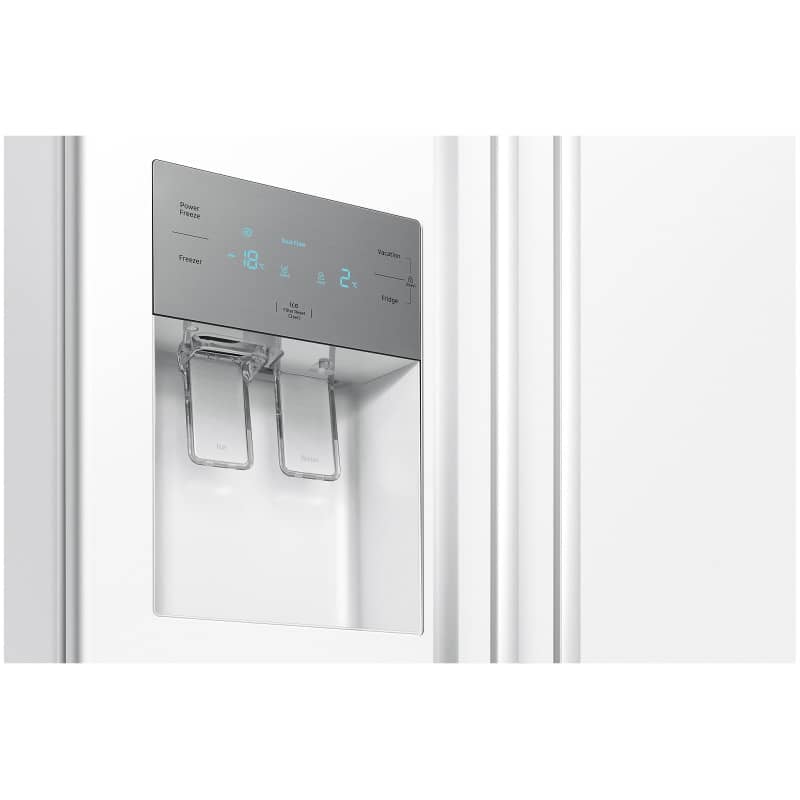 یخچال ساید بای ساید سامسونگ آر اس 50 رنگ سفید با بدنه فولاد ضد زنگ طراحی شده است و دارای دو دستگیره روکار استیل است که باز کردن درب ها را راحت می سازد. این یخچال از یک مینی بار نیز برای دسترسی به خوراکی و نوشیدنی های روزانه بهره می برد. همانطور که مشاهده می کنید محفظه یخچال در سمت راست و محفظه فریزر در سمت چپ تعبیه شده اند که هر کدام فضای جادار و بزرگی برای نگهداری مواد غذایی و خوراکی دارند. محفظه آبریز و یخریز در این دستگاه بر روی درب فریزر جایگذاری شده اند که یک صفحه نمایش LED نیز آن ها را همراهی می کند. بر روی این نمایشگر لمسی دمای هر کدام از محفظه ها و حالت قفل درب را می توانید مشاهده کنید. اگر درب بار برای شما اهمیت دارد، یخچال فریزر سامسونگ RS80 دارای درب بار بسیار بزرگتری نسبت یه این مدل میباشد. در زیر به برخی از مهمترین مشخصات طراحی این یخچال اشاره می کنیم: