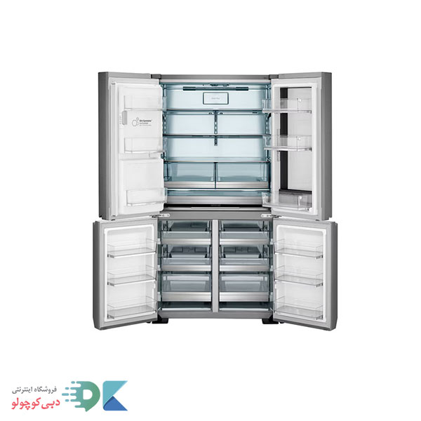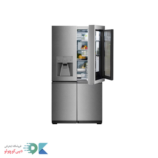 یخچالی که پیش رو داریم یک مدل 5 درب نقره ای رنگ از جنس فولاد ضد زنگ است که بر روی درب سمت چپ یخچال آبریزر را مشاهده می کنید و بر روی درب راست نیز اینستاویو! این درب اینستاویو تنها با دو بار ضربه زدن روشن می شود و چون شیشه ای است اجازه می دهد فضای داخل را مشاهده کنید. درب ها در این یخچال دارای دستگیره های مخفی هستند که به صورت افقی و نواری کار شده اند و این زیبایی دو چندانی به دستگاه می بخشد. یخچال فریزر ال جی J34 نمونه مشابه اما بدون درب اینستاویو است.
