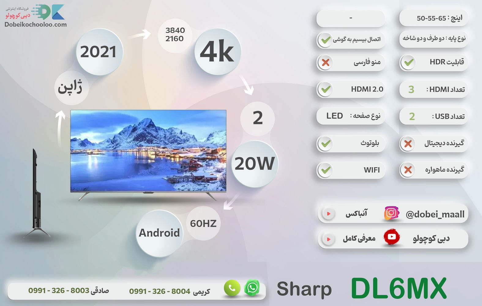 تلویزیون شارپ مدل DL6MX سایز 65 اینچ دارد و به سه پورت HDMI و USB مجهز شده است. این تلویزیون 20 وات توان صوتی دارد و با وجود کیفیت تصویر فورکا تمامی محتوا را با جزئیات کامل و دقیق نمایش میدهد. تلویزیون 65DL6MX در سال 2021 تولید و به بازار عرضه شده است. این محصول در سایزهای 50 اینچ 55 اینچ 65 اینچ تولید و به بازار عرضه شده است. شما میتوانید برای خرید تلویزیون 65 اینچ شارپ به 65DL6MX با مشاوران دبی کوچولو در ارتباط باشید و مشاوره رایگان دریافت کنید.