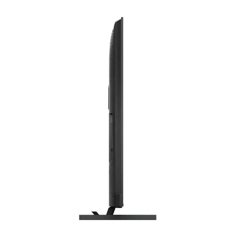 طراحی تلویزیون هایسنس 75U7Q نمایانگر تعهد این برند به اصول طراحی مدرن و مینیمال است. این نمایشگر با بهرهگیری از طراحی بدون فریم (Bezel-less)، تصویری را خلق میکند که تماماً بر محتوای در حال پخش متمرکز است و قابهای باریک اطراف صفحه نمایش، تقریباً غیرقابل مشاهده هستند. ضخامت کم این مدل (در حدود 7.7 سانتیمتر) آن را به یک نمایشگر بسیار باریک تبدیل کرده که نصب آن بر روی دیوار، جلوهای فوقالعاده شیک به دکوراسیون منزل میبخشد.