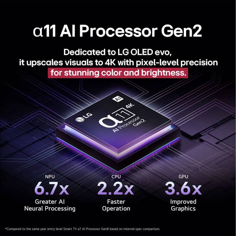 - پردازش هوشمند با α11 AI: پردازنده نسل جدید الجی با استفاده از هوش مصنوعی، به طور مداوم کیفیت تصویر و صدا را تحلیل و بهینهسازی میکند تا همواره بهترین خروجی ممکن را ارائه دهد.