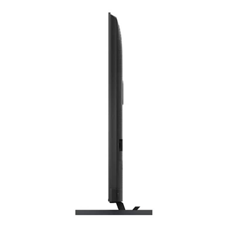 تلویزیون یو 7 کیو هایسنس در مدل 85U7Q، با ابعاد عظیم خود، یک شاهکار طراحی به حساب میآید. این نمایشگر از طراحی بدون فریم (Bezel-less) بهره میبرد که ابعاد صفحه نمایش را به حداکثر میرساند و تجربه دیداری را عمیقتر میکند. ساختار کلی این تلویزیون با ضخامت نسبتاً کم (حدود 8.0 سانتیمتر)، ظاهری لوکس و کمحجم دارد. بدنه از پلاستیک فشرده مرغوب ساخته شده است که استحکام لازم برای سایز 85 اینچ را فراهم میکند و در عین حال وزن دستگاه را مدیریت میکند.