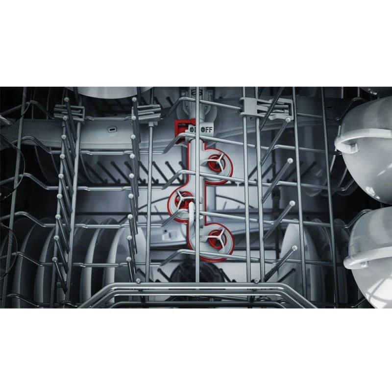 طراحی داخلی این محصول به گونه ای است که برای هر نوع ظرفی فضای مخصوصی دارد. ماشین ظرفشویی 3 سبد بوش 85M دارای سبدهای سری Max Flex است که منعطف ترین نوع سبد در محصولات بوش میباشد. سبد اول یا همان VarioDrawer مخصوص قاشق، چنگال و فنجان های کوچک قهوه خوری است. سبد میانی مجهز به سیستم Rackmatic است که به شما اجازه میدهد ارتفاع سبد را در 3 مرحله و تا 5 سانتی متر در این ظرفشویی 14 نفره بوش جابجا کنید تا برای قابلمه های بزرگ در سبد پایین جا باز شود. در سبد پایین نیز بخشی به نام IntensiveZone وجود دارد؛ اگر ظروف بسیار کثیف مانند تابه های سوخته دارید، آنها را در سبد پایین بچینید و این گزینه را فعال کنید تا فشار آب در این منطقه 20 درصد بیشتر شود در حالی که ظروف سبد بالا با فشار ملایم شسته میشوند. همچنین تمامی سبدها دارای پایه های تاشو (Folding racks) هستند تا بتوانید بر اساس حجم ظروف، فضای داخلی را شخصی سازی کنید. این سطح از مهندسی را فقط میتوان در ماشین ظرفشویی اصل آلمان بوش 85M نقره ای پیدا کرد.