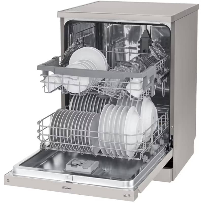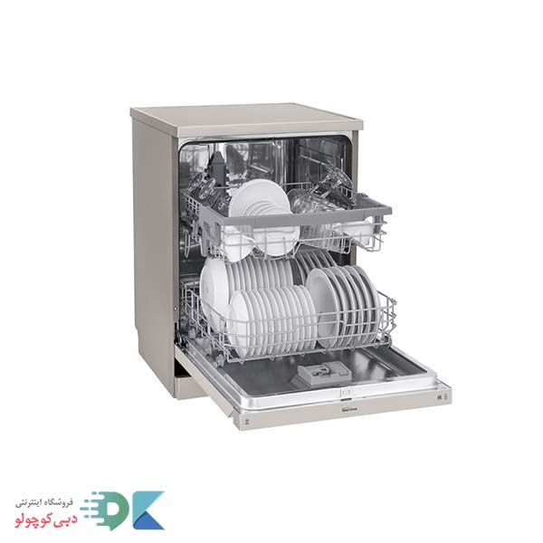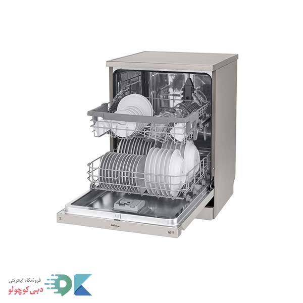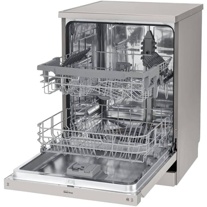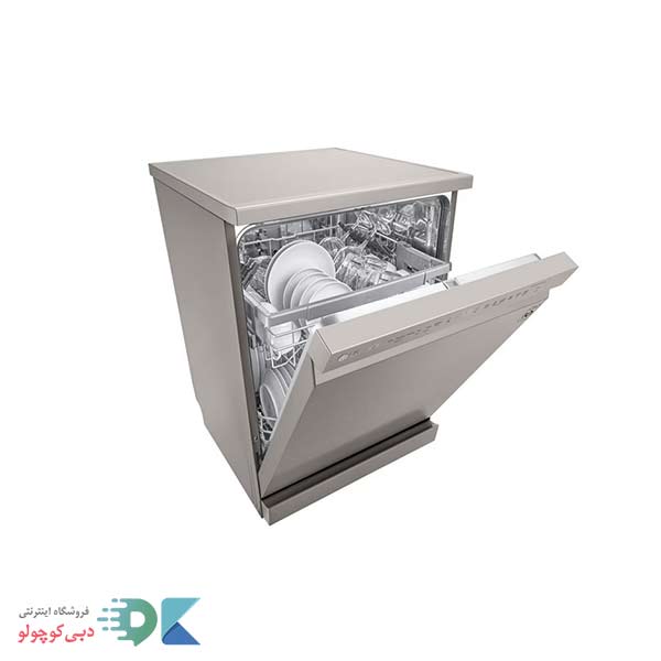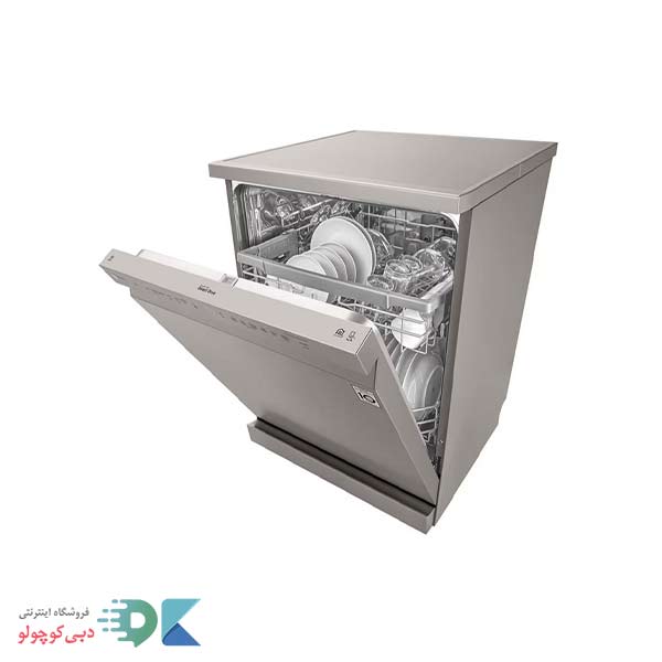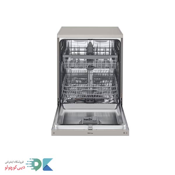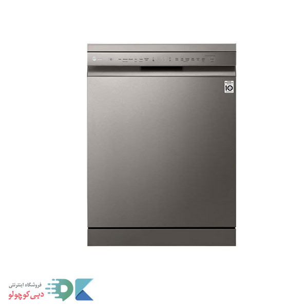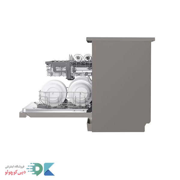 دستگاهی که پیش رو داریم یک ظرفشویی مبله نقره ای رنگ است که بدنه و سطح داخلی آن از استیل ضد زنگ ساخته شده و دارای 2 طبقه برای نگهداری و جایگذاری ظروف می باشد. درب این ماشین ظرفشویی به سمت پایین باز می شود و با باز کردن آن شاهد کنترل پنل لمسی هستیم که می توانید از طریق آن برنامه و توابع را مدیریت کنید. یکی از اصطلاحاتی که ال جی در طراحی این ظرفشویی به کار برده EasyRack است و به معنی تنظیم راحت طبقات و سبدهای ماشین ظرفشویی است. در رابطه با کنترل پنل و صفحه نمایش ماشین ظرشویی باید بگوییم که نمایشگر آن از نوع سگمنتی می باشد که می توانید در آن مدت زمان باقی مانده، وضعیت شستشو، مقدار نمک باقی مانده و پیغام های خطا را مشاهده نمایید.