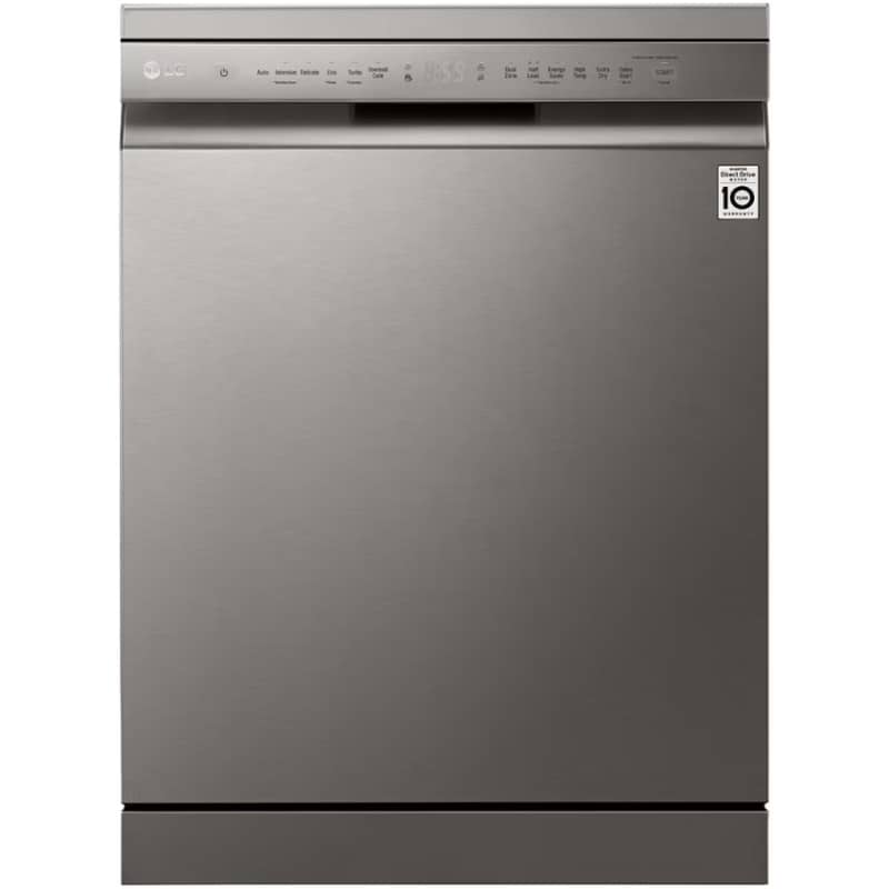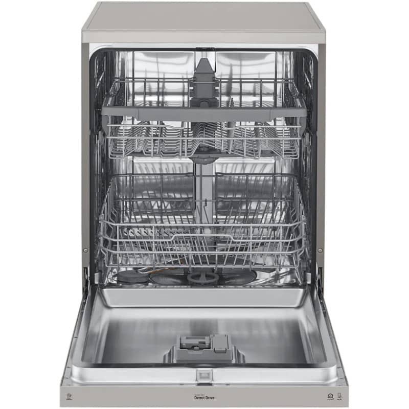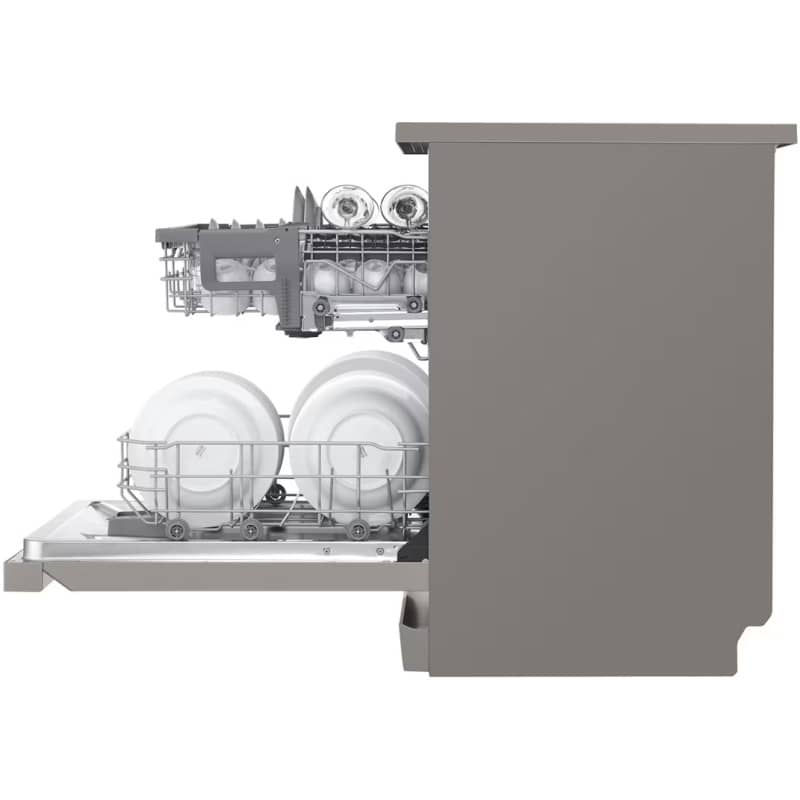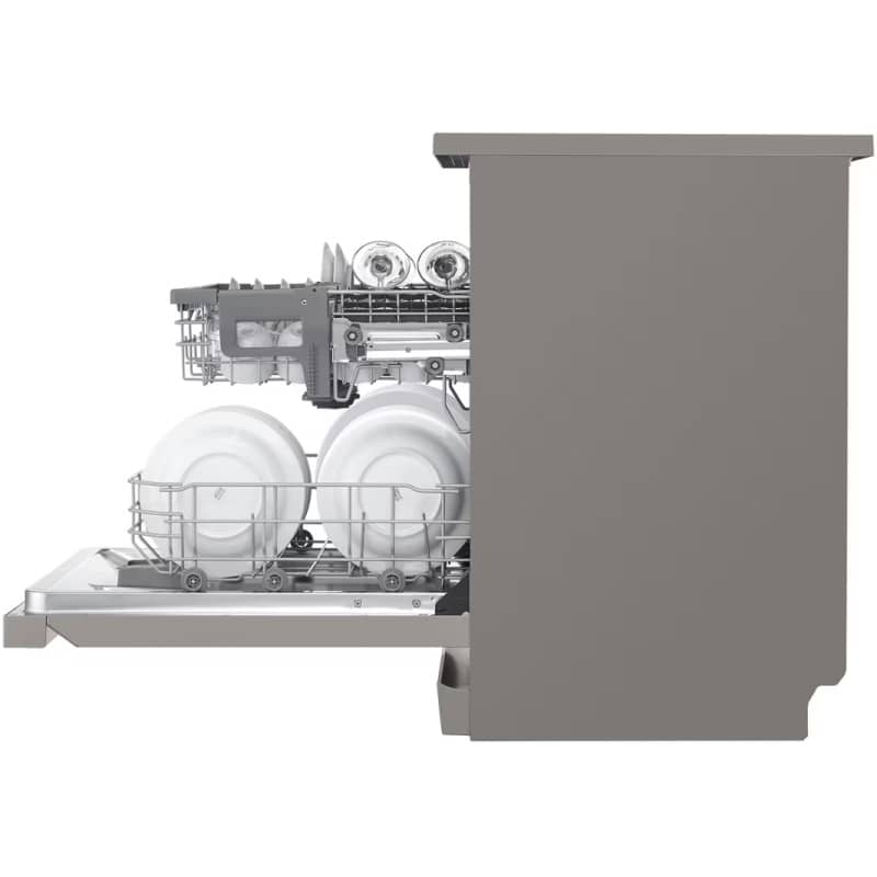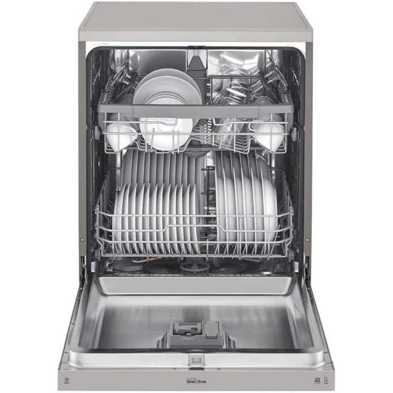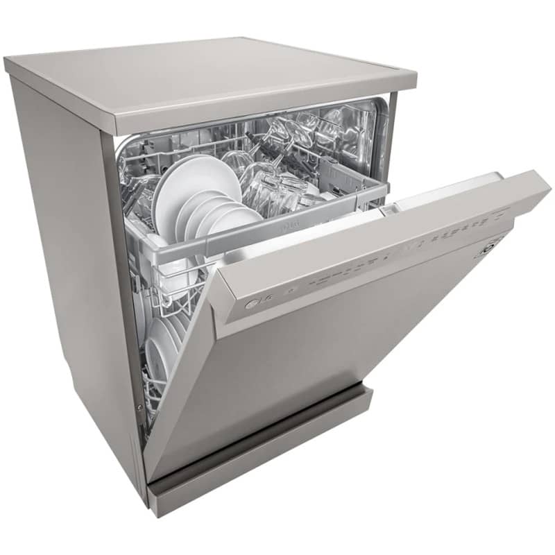 دستگاهی که پیش رو داریم یک ظرفشویی مبله نقره ای رنگ است که بدنه و سطح داخلی آن از استیل ضد زنگ ساخته شده و دارای 2 طبقه برای نگهداری و جایگذاری ظروف می باشد. درب این ماشین ظرفشویی به سمت پایین باز می شود و با باز کردن آن شاهد کنترل پنل لمسی هستیم که می توانید از طریق آن برنامه و توابع را مدیریت کنید. یکی از اصطلاحاتی که ال جی در طراحی این ظرفشویی به کار برده EasyRack است و به معنی تنظیم راحت طبقات و سبدهای ماشین ظرفشویی است. در رابطه با کنترل پنل و صفحه نمایش ماشین ظرشویی باید بگوییم که نمایشگر آن از نوع سگمنتی می باشد که می توانید در آن مدت زمان باقی مانده، وضعیت شستشو، مقدار نمک باقی مانده و پیغام های خطا را مشاهده نمایید.