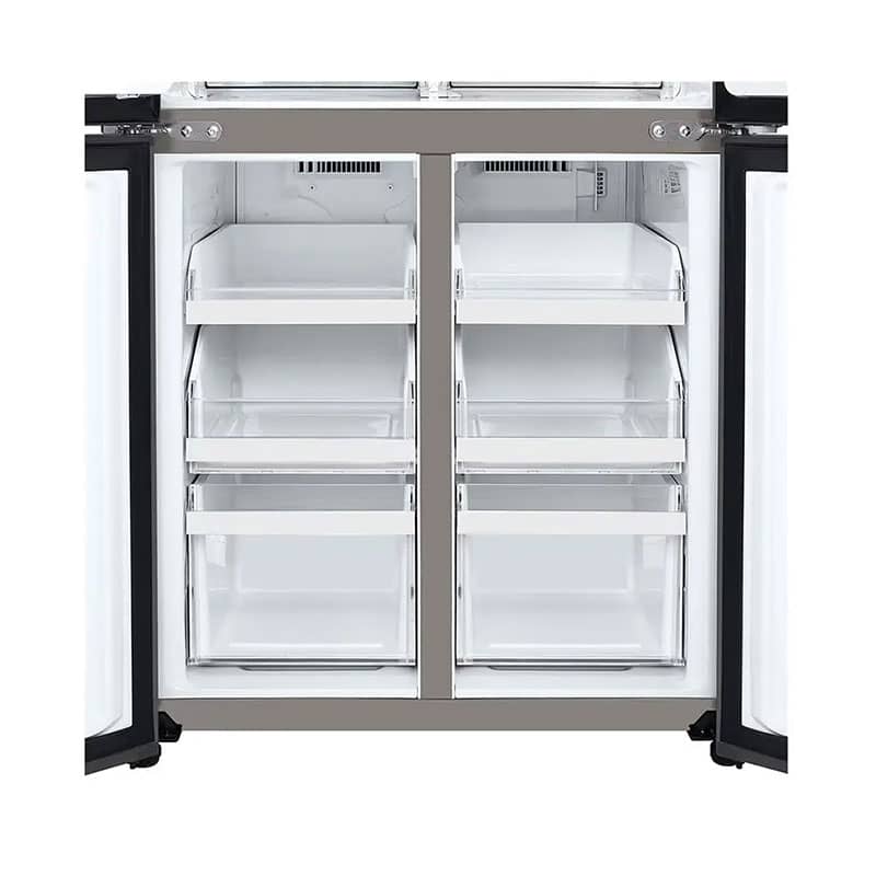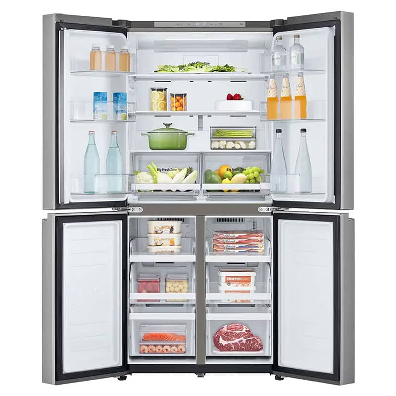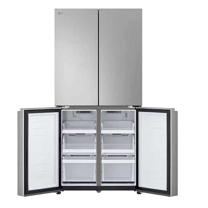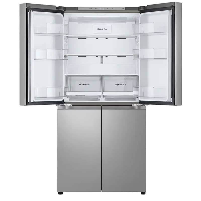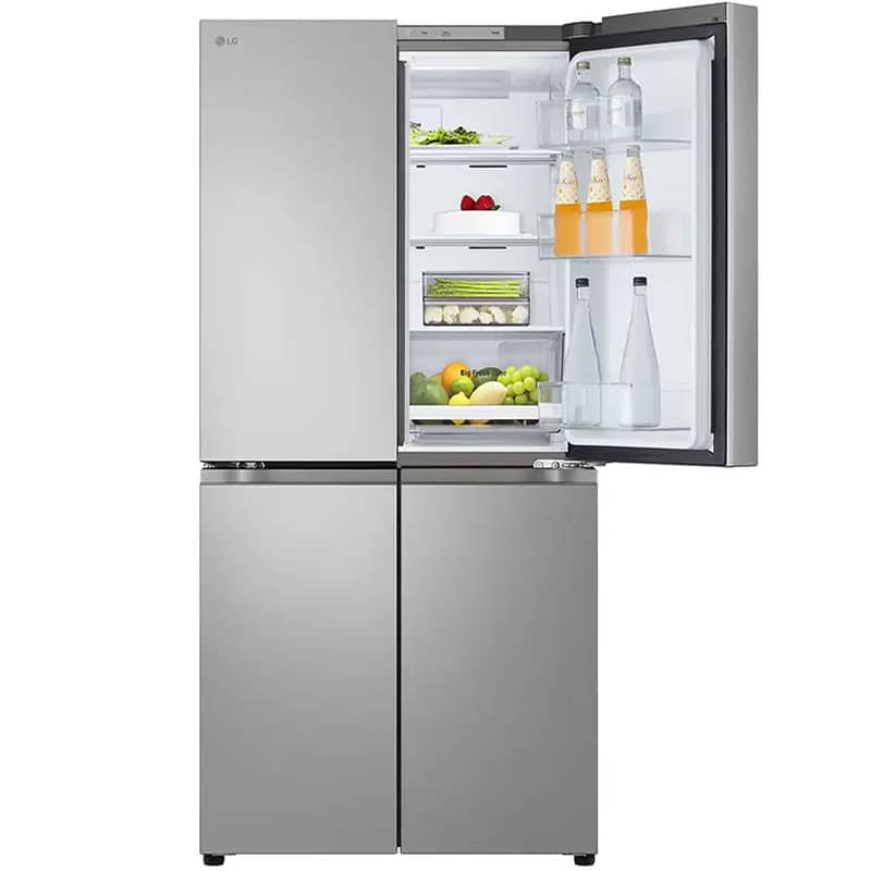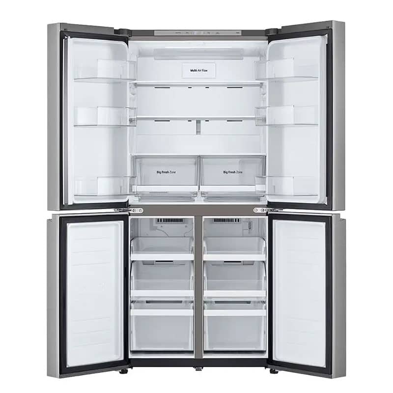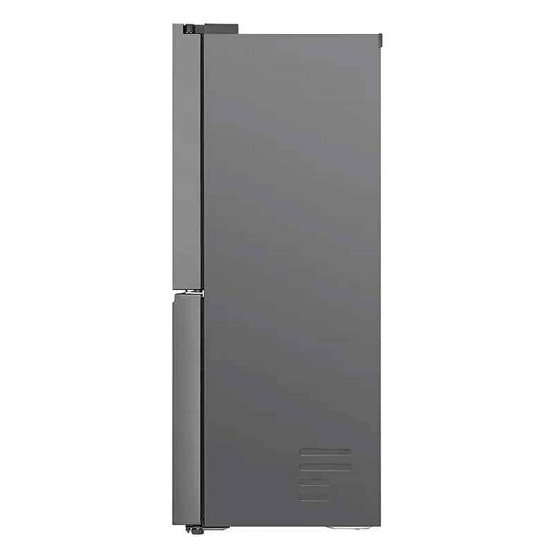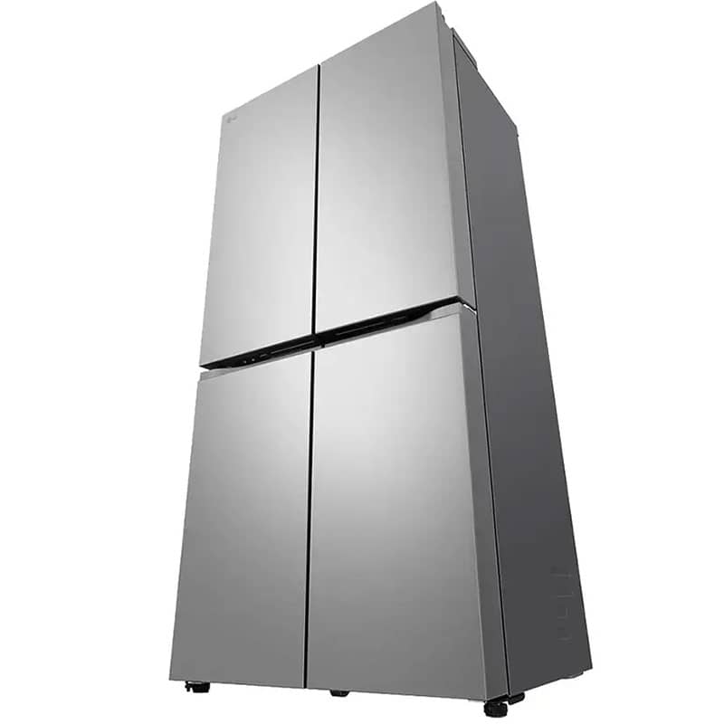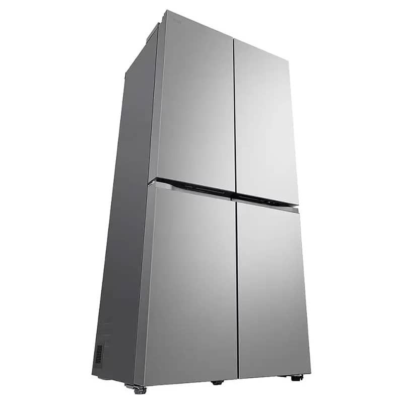 طراحی ظاهری یخچال ساید بای ساید ال جی B334 نقرهای، جلوهای از سادگی و کارایی مدرن است. این دستگاه به سبک چهار درب (French Door/Multi Door) طراحی شده است؛ دو درب در قسمت بالا برای دسترسی به بخش یخچال و دو درب در قسمت پایین برای دسترسی به بخش فریزر. همانطور که قبلاً اشاره شد، قابلیت Slim Width با عرض 835 میلیمتری این محصول، یک مزیت کلیدی برای آشپزخانههایی است که فضای کافی برای ساید بای سایدهای عریض ندارند.