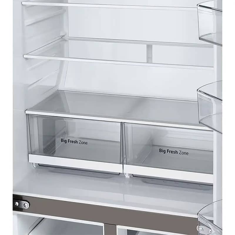 در قسمت پایین یخچال، 2 کشوی مخصوص برای نگهداری میوه و سبزیجات وجود دارد. این کشوها که تحت عنوان Fresh Zone شناخته میشوند، دارای فناوری پیشرفته Moist Balance Crisper هستند. Moist Balance Crisper یک پوشش توری-مشبک (Lattice-type Box Cover) است که در بالای کشو قرار دارد و وظیفه آن کنترل و حفظ رطوبت بهینه در داخل کشو است. رطوبت تبخیر شده از میوهها و سبزیجات به جای اینکه صرفاً تبخیر شود، بر روی این توری مشبک متراکم شده و به صورت تدریجی دوباره به محیط کشو باز میگردد. این عمل باعث حفظ سطح رطوبت ایدهآل برای میوهها و سبزیجات شده و طراوت و تازگی آنها را برای مدت زمانی طولانیتر حفظ میکند. روشنایی فضای داخلی نیز توسط یک لامپ خطی LED که در سقف تعبیه شده، تأمین میشود. نور LED علاوه بر مصرف انرژی بسیار پایین، روشنایی کامل و بدون تولید حرارت را فراهم میکند.