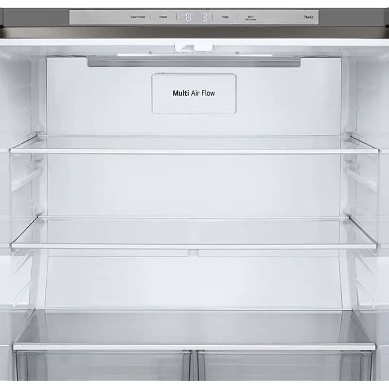برای اطمینان از تازگی پایدار و طولانی مدت مواد غذایی، یخچال فریزر 24 فوت ال جی B334 نقرهای از دو سیستم پیشرفته خنکسازی استفاده میکند که هر دو مبتنی بر عملکرد دقیق کمپرسور خطی اینورتر هستند. فناوری LinearCooling™ انحصاری ال جی، برای حفظ حداکثر تازگی و طعم مواد غذایی طراحی شده و با همکاری کمپرسور Inverter Linear Compressor کار میکند تا نوسانات دمایی داخلی را به شدت کاهش دهد. طبق گفته ال جی، LinearCooling™ دمای داخلی را با دقت بسیار بالا، در محدوده بسیار باریک ±0.5°C ثابت نگه میدارد. این پایداری و ثبات دمایی دقیق، نقش حیاتی در حفظ رطوبت، بافت و مواد مغذی مواد غذایی دارد و طعم و تازگی میوهها، سبزیجات و سایر مواد غذایی را برای مدت طولانی، تا 7 روز یا بیشتر، همانند روز اول خرید، حفظ میکند. علاوه بر این، سیستم خنکسازی Multi Air Flow (جریان هوای چندگانه) توزیع هوای خنک را در تمامی فضای داخلی تضمین میکند. این سیستم با استفاده از دریچههای متعدد که به صورت استراتژیک در بخشهای مختلف داخلی یخچال فریزر GCB-334DFPL قرار داده شدهاند، هوای سرد را به صورت کاملاً یکسان و یکنواخت بین تمامی طبقات و کشوها توزیع میکند تا هیچ نقطه گرمی (Warm Spot) در یخچال وجود نداشته باشد و مواد غذایی در هر کجا که قرار گرفته باشند، به سرعت و به طور موثر خنک شوند. این تکنولوژی همچنین به بازیابی سریع دما در هنگام باز و بسته شدن دربها کمک میکند.