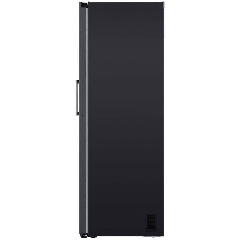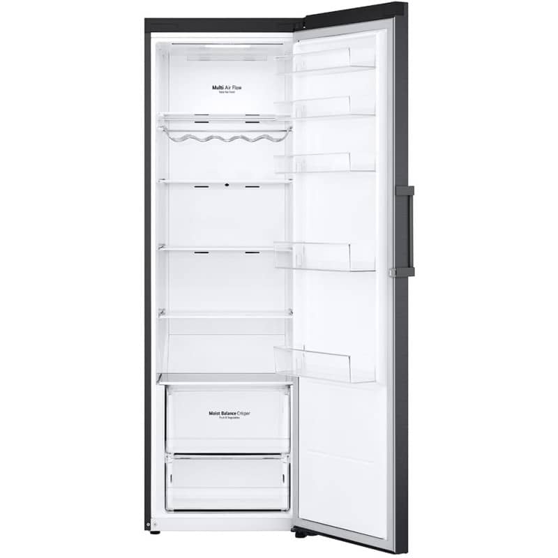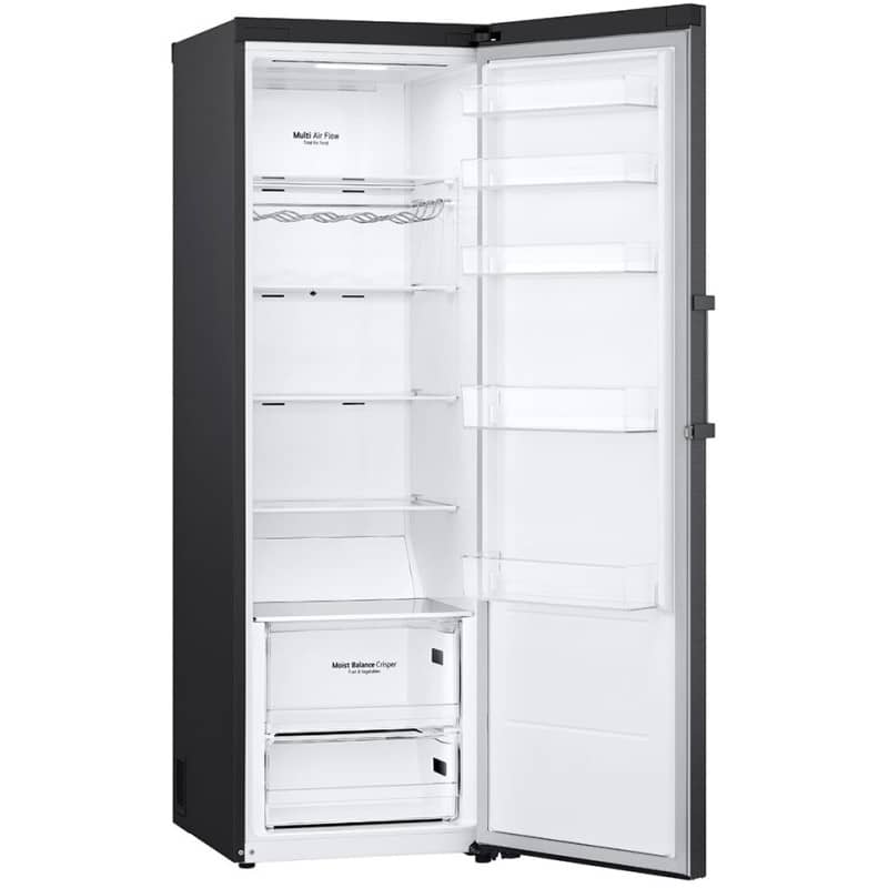 یکی از تکنولوژیهای انحصاری و بسیار کاربردی ال جی در قسمت یخچال این محصول، Door Cooling+ است. این تکنولوژی به طور خاص برای رفع مشکل گرمتر بودن درب یخچال نسبت به سایر نقاط طراحی شده است. در سقف یخچال، یک دریچه هوای خطی و عریض تعبیه شده که هوای سرد را مستقیماً به سمت درب و قفسههای روی آن هدایت میکند. این کار دو مزیت عمده دارد: اول اینکه مواد غذایی و نوشیدنیهای قرار گرفته در قفسههای درب (که معمولاً گرمترین نقطه هستند) بسیار سریعتر خنک میشوند (ال جی ادعا میکند تا 32% سریعتر). دوم اینکه هنگام باز کردن درب یخچال، این سیستم یک “دیوار هوای سرد” ایجاد میکند که مانع از خروج سریع هوای سرد داخل و ورود هوای گرم بیرون میشود و به پایداری دما کمک شایانی میکند.