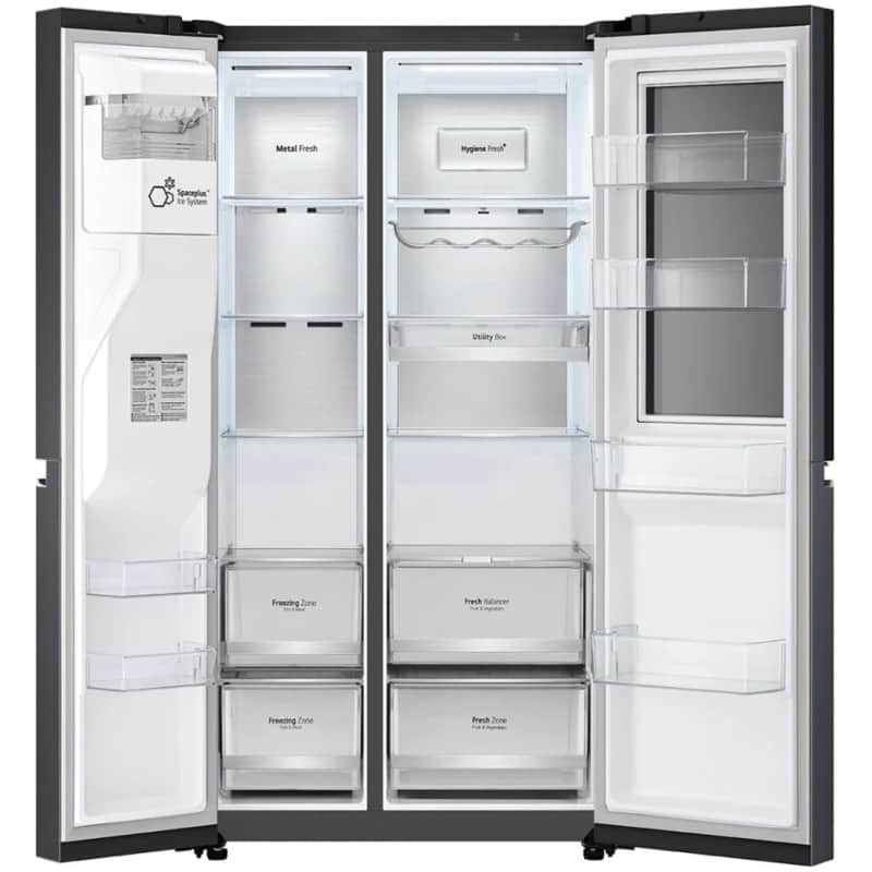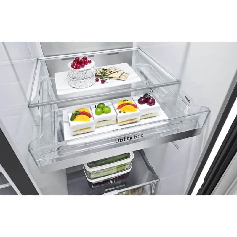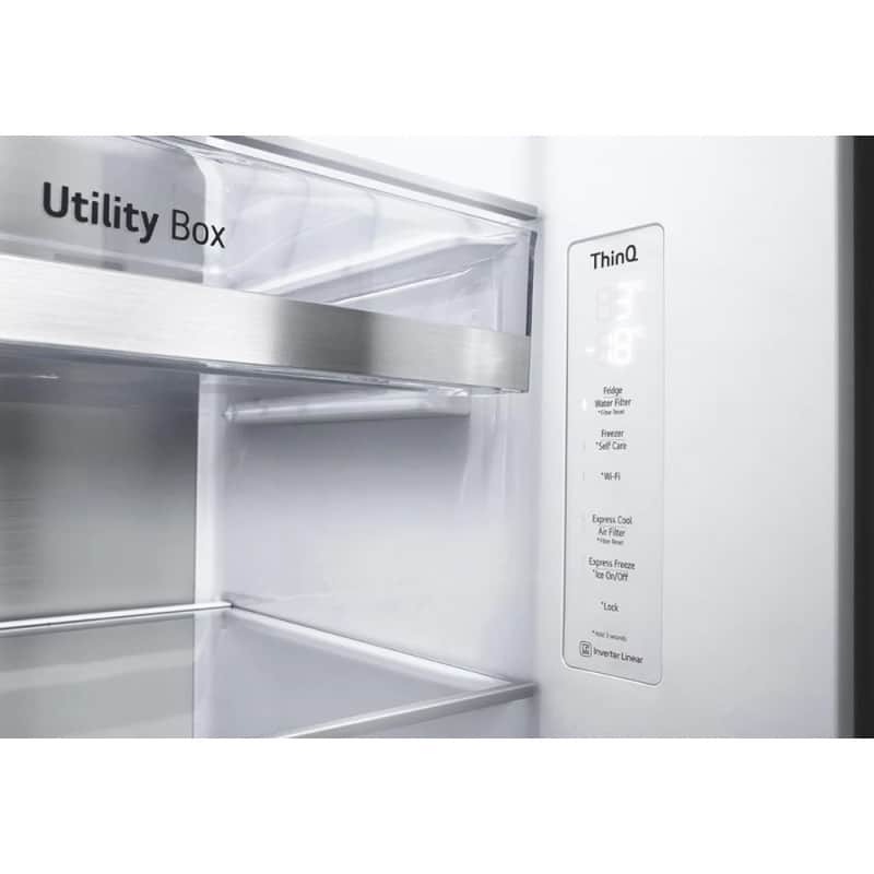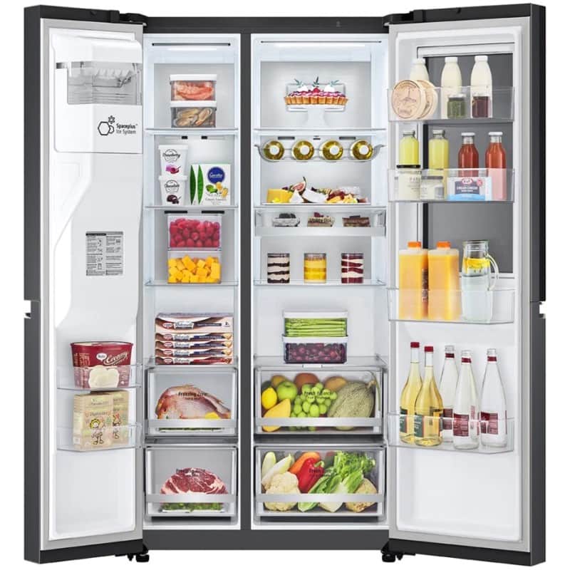 یخچال فریزر ال جی X287 رنگ مشکی مات با ظرفیت 30 فوت یا 674 لیتر به شما این امکان را می دهد تا انواع مواد غذایی را بتوانید در داخل یخچال جای دهید. 4 عدد طبقه با ارتفاع زیاد داخل یخچال قرار دارد در بین این طبقه ها یک طبقه جداگانه مخصوص نوشیدنی قرار دارد که می توانید 4 بطری بلند را در این طبقه ها جای دهید. همچنین در بین این 4 طبقه یک طبقه دیگر به نام Utility Box قرار دارد این طبقه فقط مخصوص مواد غذایی کوچک طراحی شده است. 2 عدد کشوه مخصوص میوه و سبزیجات نیز در این یخچال فریرز 30 فوت ال جی قرار دارد. 5 عدد طبقه داخل درب یخچال هم به به شما این امکان را می دهد تا بتوانید اقلام کوچک مانند: سس، مربا، کره، آبلیمو و …. را قرار دهید. در داخل یخچال یک صفحه نمایش لمسی قرار دارد که دمای بخش فریزر و یخچال را به شما نشان می دهد. در داخل فریزر 4 طبقه و 2 عدد کشو Frezh Zone به علاوه 2 عدد طبقه روی درب فریزر قرار دارد.