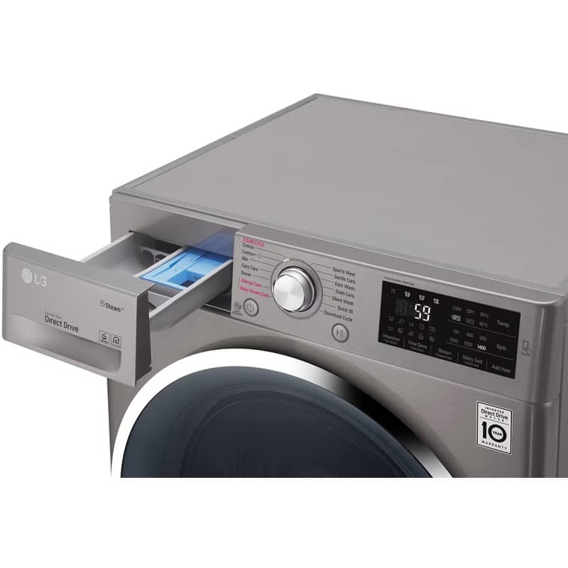 ماشین لباسشویی ال جی J6 مدلی 8 کیلویی در میان لباسشویی های درب از جلو این شرکت است که در رنگ خاکستری و با درب شیشه ای تولید و زراحی شده؛ این ماشین لباسشویی از موتور اینورتر دایرکت درایو بهره می برد و این عملکرد طولانی مدت آن را تضمین خواهد کرد؛ همچنین 14 برنامه شستشو، دست شما را برای شستن هر نوع لباسی باز می گذارند. در مدل F4J6TNP8S می توانید از شستشو با بخار و یا شستشو با آب سرد برای لباس های حساس استفاده کنید و یا انواع لباس های حریر و توری را با برنامه متناسب شستشو دهید. این موارد علاوه به بهوبد عملکرد و افزایش ارزش خرید لباسشویی ال جی به مراتب خواهد افزود.