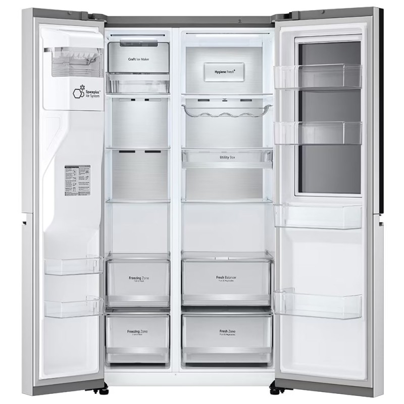 همانطور که اشاره شد، یخچال فریزر GR-X267CSHS ال جی دارای ظرفیت کلی 30 فوت یا 635 لیتر است. این گنجایش به صورت هوشمندانه بین بخشهای مختلف تقسیم شده است؛ 422 لیتر به محفظه یخچال و 213 لیتر به محفظه فریزر اختصاص یافته است. فضای داخلی یخچال شامل 4 طبقه اصلی، یک قفسه مخصوص نگهداری بطری به صورت افقی (Wine Rack) و دو کشوی بزرگ برای نگهداری میوهها و سبزیجات است. علاوه بر این، یک کشوی کاربردی به نام Utility Box نیز برای نگهداری مواد غذایی کوچکتر مانند پنیر، کره و لبنیات طراحی شده است. روی درب یخچال نیز 4 قفسه جادار برای قرار دادن انواع بطریها و ظروف مرتفع تعبیه شده است. در بخش فریزر، 4 طبقه و 2 کشوی بزرگ وجود دارد که فضای کافی برای انجماد انواع مواد غذایی را فراهم میکنند. روشنایی داخلی توسط لامپهای LED تأمین میشود که علاوه بر مصرف انرژی بسیار پایین و تولید گرمای ناچیز، نور یکنواختی را در تمام زوایای یخچال پخش میکنند. طبقات داخلی از جنس شیشه حرارتدیده و مقاوم (Tempered Glass) ساخته شدهاند که توانایی تحمل وزن بالا را دارند و در برابر ضربه و خش مقاوم هستند. قابلیت Metal Fresh که در واقع همان پنل فلزی Metal Cooling در دیواره پشتی یخچال است، به حفظ و تثبیت دمای سرد داخل دستگاه کمک کرده و پس از باز و بسته شدن درب، به سرعت دما را به حالت ایدهآل بازمیگرداند. دو کشوی مهم این یخچال شامل Fresh Balancer و Fresh Zone هستند؛ کشوی Fresh Balancer با قابلیت تنظیم رطوبت، شرایط ایدهآلی را برای نگهداری طولانیتر میوهها (حالت Fruits) و سبزیجات (حالت Vegetables) فراهم میکند.