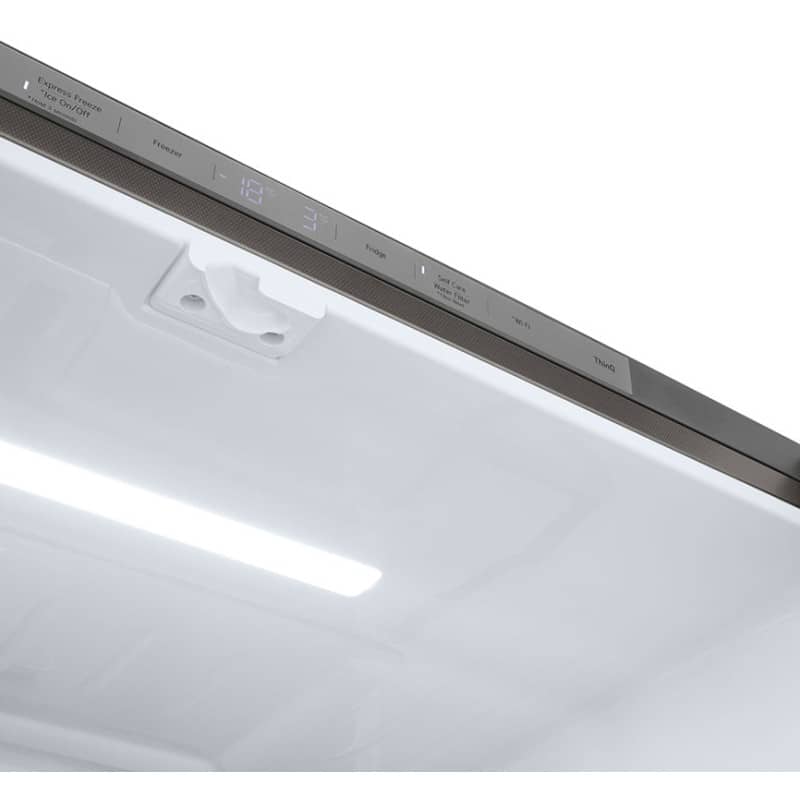 پنل کنترلی این یخچال فریزر قسمت بالای آن قرار گرفته است و برای دسترسی به آن نیاز است درب یخچال را باز نمایید. از طریق این پنل میتوانید تنظیمات مختلف یخچال فریزر مانند دما را تغییر داده و همچنین به برخی قابلیتها مانند Express Freeze و Self Care و موارد دیگر دسترسی داشته باشید و از وضعیت کلی یخچال مانند اتصال به اینترنت، فیلتر آب و برخی موارد دیگر اطلاع پیدا کنید. با توجه به اینکه پنل یخچال در بالای آن قرار دارد، ال جی تصمیم گرفته است قابلیت قفل کودک (Child Lock) را از این یخچال حذف نماید.
