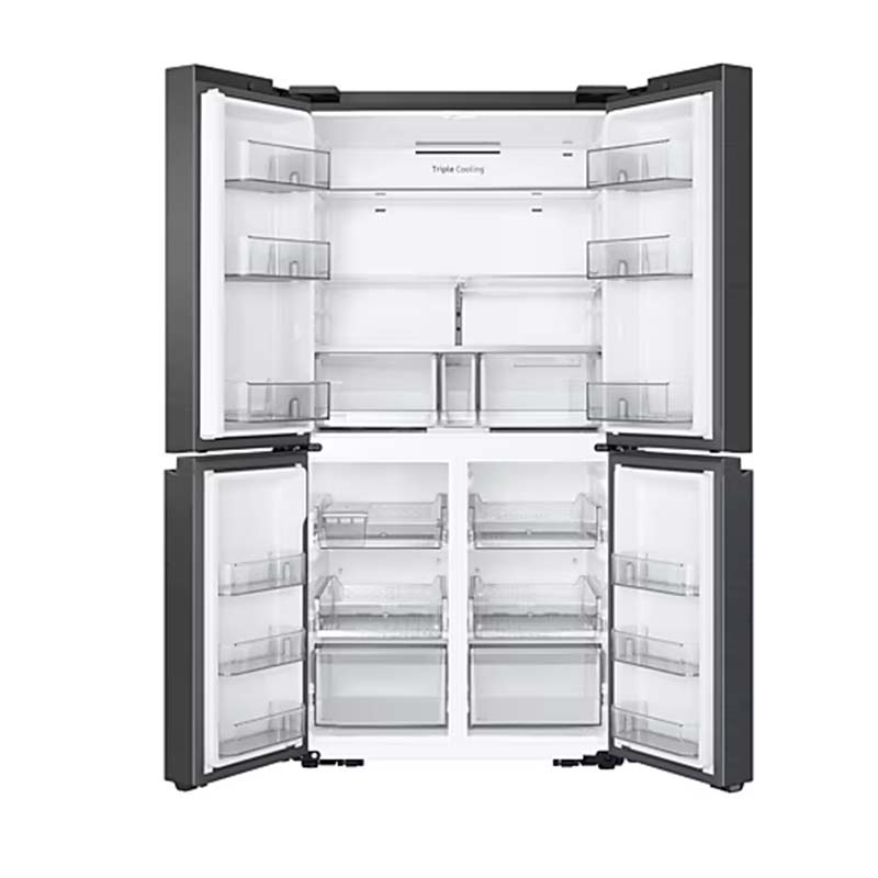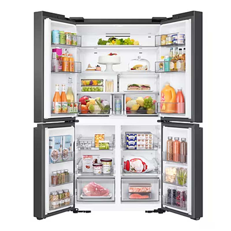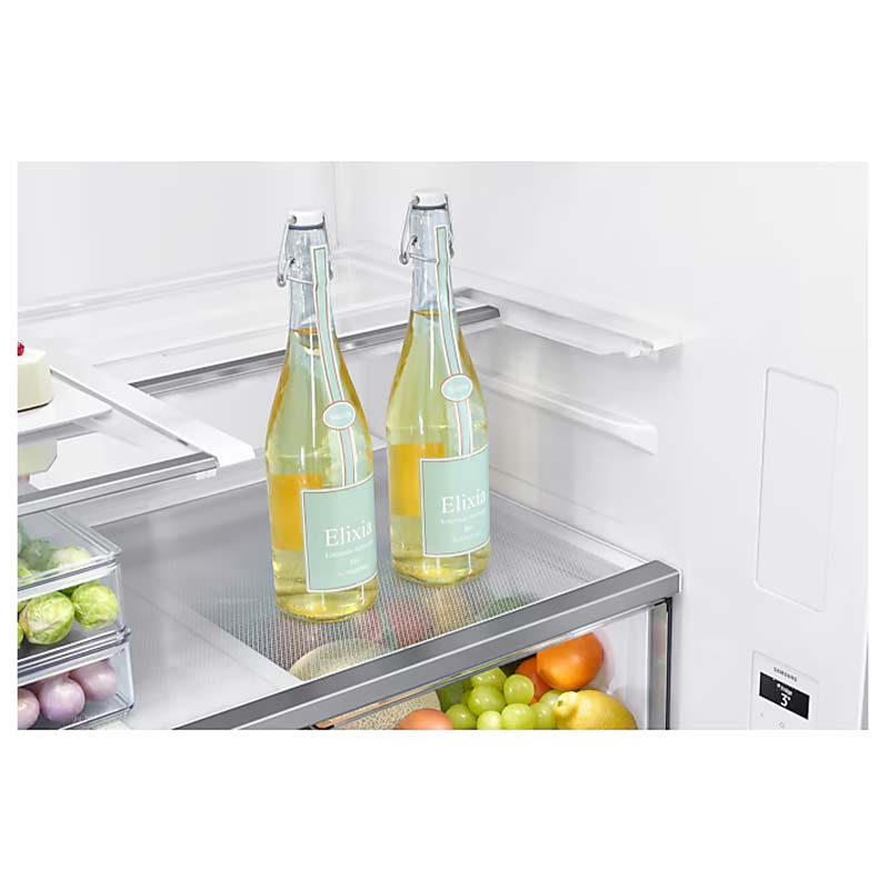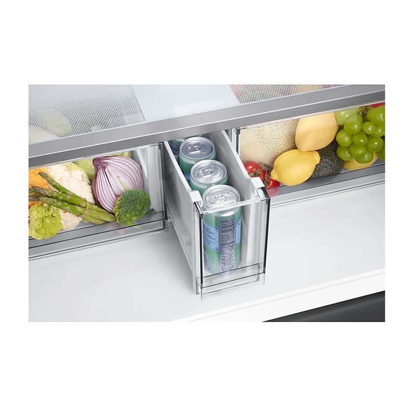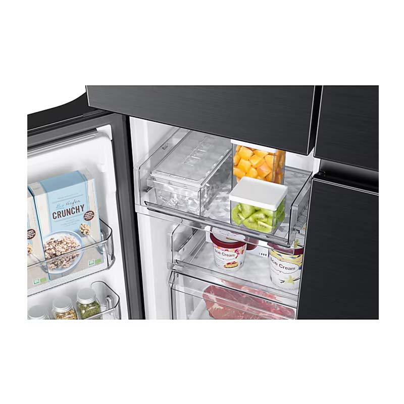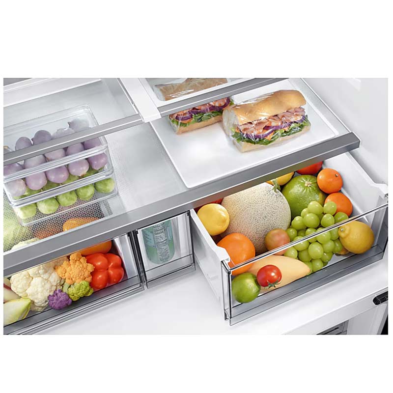 داخل این یخچال فریزر 30 فوت سامسونگ، 3 طبقه شیشهای مقاوم وجود دارد که عرض آن ها زیاد و ارتفاع این طبقه ها قابل تنظیم است بنابراین می توانید بسته به نیاز خود انواع نوشیدنی و ظروف بزرگ را در آن ها قرار دهید. طبقه 2 قابلیت تا شدن را دارد تا بتوانید انواع نوشیدنی با ارتفاع زیاد یا انواع قابلمه و ماهی تابه را در آن جای دهید. همچنین 2 کشو مخصوص میوه و سبزیجات در یخچال تعبیه شده است. علاوه بر این 6 طبقه روی درب های یخچال وجود دارد که می توانید مواد لبنی، سس، مربا و سایر خوراکی را در آن ها نگه دارید. یک صفحه نمایش لمسی LED کنار کشوی میوه و سبزیجات تعبیه شده که اطلاعاتی مانند دمای یخچال و فریزر و سایر قابلت های کاربردی را نشان می دهد. قسمت فریزر که در پایین قرار دارد دارای دو درب است. داخل فریزر 4 طبقه و 2 کشو و 6 طبقه قفسه روی درب تعبیه شده است. می توانید انواع بستنی، شیر، میوه و نوشیدنی را در این طبقه ها قرار دهید.