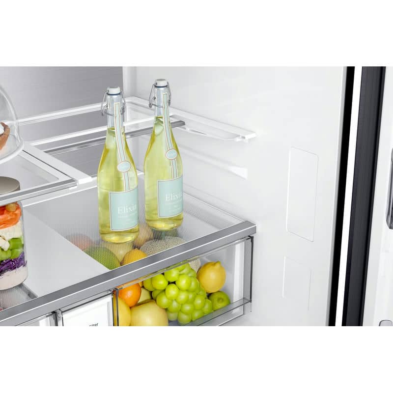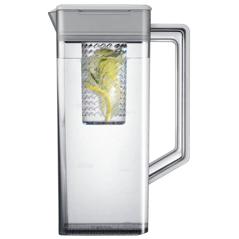 یخچال دور این دور سامسونگ RF71 دارای محفظه Beverage Center است که شامل یک آبریز (Water Dispenser) و پارچ AutoFill Pitcher با ظرفیت 1.4 لیتر میباشد. این پارچ که دارای تاییدیه Dishwasher Safe از SGS و فاقد مواد مضر (BPA Free) است، به صورت خودکار پر شده و به کمک Infuser (صافی) امکان تهیه دتاکس واتر (Detox Water) را فراهم میکند. سیستم یخساز Dual Auto Ice Maker در فریزر، قادر است دو نوع یخ تولید کند: یخ حبهای (Cubed Ice) و یخ ریز (Ice Bites). ظرفیت ذخیرهسازی یخ حبهای 1.9 کیلوگرم و یخ ریز 2.2 کیلوگرم است. توجه داشته باشید که این مدل فاقد یخریز روی درب است و یخها باید با سرتاس مخصوص از کشوها برداشت شوند. فیلتر تصفیه آب مدل HAF-QIN با تاییدیه NSF، ذرات معلق تا 0.5 میکرون را از آب حذف کرده و آبی کاملاً بهداشتی ارائه میدهد.